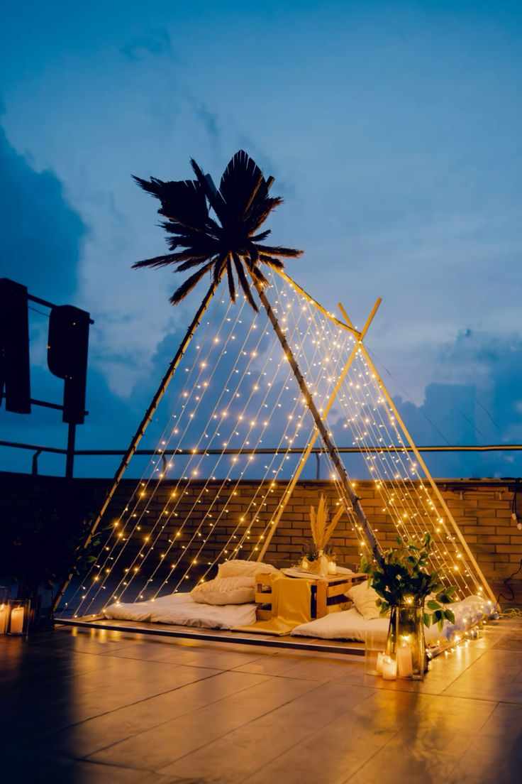 Soft fairy lights wrapped around the railing.